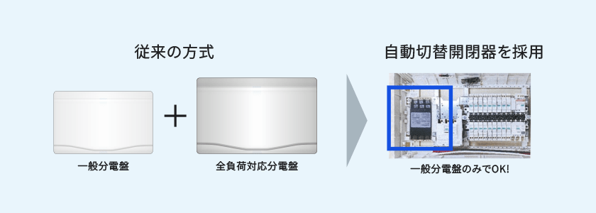 一般分電盤にコンパクトに設置でき、全負荷対応分電盤が不要なため、