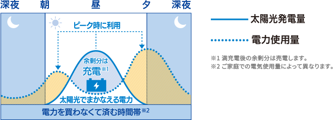 昼間、太陽光発電の余剰電力を蓄えて、夜間や朝夕の電力使用ピーク時に有効活用するモードです。電気代が節約できます。太陽光発電の電気では足りない場合は、深夜に充電することが可能です。