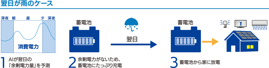 過去の電力使用状況や天気、太陽光発電量などのさまざまなデータをAIが学習し、翌日の発電量、電力使用量を予測し、余剰電力量を算出。毎日、自家消費を目指した運転を自動で設定するため、太陽光発電の最大活用が目指せます。
