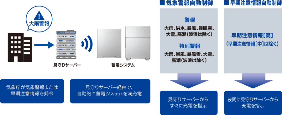 お住まいの地域に気象警報や早期注意情報[高]が発表されたら、自動で蓄電システムを充電して停電に備えます。