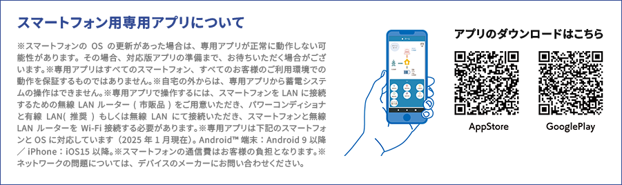 ●購入時に補助金の交付を受けた方は設置時から一定期間の使用が義務付けられる場合があり、その間は本製品を適正にご使用していただく必要があります。期間内に修理が必要になった場合は、お買い上げの販売会社にご連絡ください。●蓄電池からの放電中の動作について、電力会社の取り決めにより、放電中に微量電力を買電しています。蓄電池に貯めた電力は太陽光発電システムと異なり、電力事業者と特定の契約をして逆潮流が許可された場合を除き、電力系統に逆潮流させない決まりとなっています。なお、その買電量は、ご家庭の使用環境により、変動します。安定状態では約30W前後の買電となりますが、状況により100Wを超える場合もあります。●温度が高い時は、保護機能により蓄電システムの出力を一時的に抑制することがあります。●蓄電池のメンテナンスモードについて、蓄電システムの性能維持のために、年1回(5月)自動でメンテナンスモードを実行します。メンテナンスモードとは、蓄電池を自動的に点検するモードです。ご家庭の消費電力量が少ない場合は、一日でメンテナンスモードが終了しないことがあります。メンテナンスモードは蓄電池の性能を維持するために必要な機能です。また、メンテナンスモード時には200W以上消費する家電製品を接続して動作させてください。●電波障害となる場合がありますので、ラジオ・テレビとは3m以上離してください。●本製品には、途中で電源が切れると困る家電製品は接続しないでください。停電時に夜間や曇りなどで発電電力または蓄電池の電力が不足すると装置は停止し、家電製品の電源が切れます。大切なデータの入ったパソコン等、途中で電源が切れると困る電気製品は接続しないでください。●停電時に一度に多くの機器をご使用になると保護のために出力が頻繁に停止し、機器の故障の原因となることがあります。ポンプやモーターなど起動時に大きな電力を必要とするものは使用しないでください。●センサー機能や調光機能がある照明は、停電時にちらつく場合や、動作しない場合があります。●ドライヤーや温水便座など自立運転が停止し、再起動する場合があります。その際は使用している機器のコンセントを抜いてください。●燃料電池を併設する場合は、設置・接続方法などを販売店へお問い合わせください。●外付け太陽光発電に制約がある場合(メーカー、型番、容量)があります。●近隣にアマチュア無線局がある場合、電波受信に影響を与える可能性がありますので、事前に販売店にご相談ください。●外付け太陽光発電の余剰電力をグリーンモードで余剰充電する場合には、すべての余剰電力を充電することはできません(100ー200W売電します)。●動作温度範囲外では運転を停止します。●本機ソフトウェア更新中は、最大で数十分程、運転停止いたします。●スマートフォンのOSの更新があった場合は、アプリが正常に動作しない可能性があります。その場合、対応版アプリの準備まで、お待ちいただく場合がございます。●専用アプリはすべてのスマートフォン、すべてのお客様のご利用環境での動作を保証するものではありません。